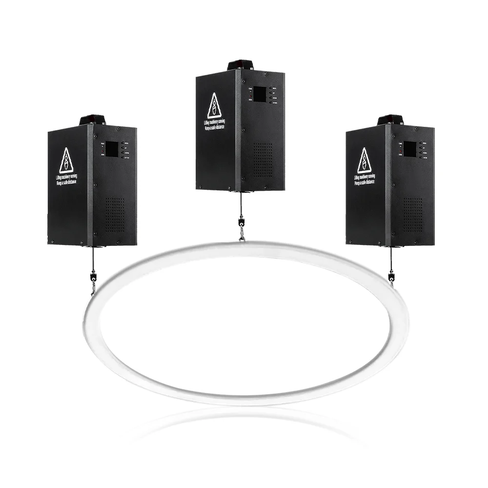 Kinetic Ring D80 см — крупное кинетическое световое кольцо с тремя независимыми лебёдками. 144 RGB SMD LED обеспечивают яркую и равномерную подсветку, а система подъёма позволяет создавать сложные объёмные движения в воздухе.