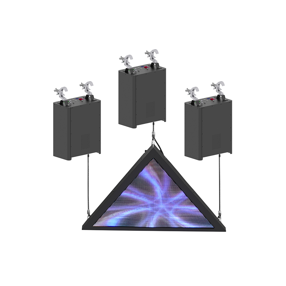 Kinetic Triangle Screen — кинетический треугольный LED-экран со стороной 80 см и шагом пикселя P3.91. Управляется тремя независимыми лебёдками, что позволяет создавать динамичные объёмные движения и сложные пространственные композиции.
